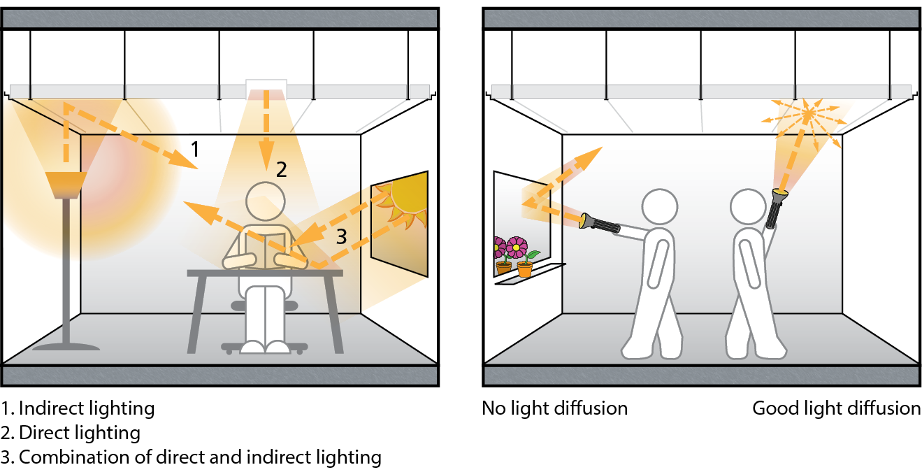 The quality of modern artificial light has improved, but the most comfortable and economical light still comes from the sun, although not sufficient and often combined with artificial light. As a result, not only the amount of light, but also the quality of light is important. Both need to be adapted to the working circumstances in a room. The light reflecting capacity of a ceiling will not only contribute to a reduction in electricity bills but will also improve the quality of lighting conditions. Next to sunlight and artificial light we can make a distinction between direct and indirect light. Direct light will light directly, whereas indirect light is the result of light reflection. As the ceiling is the only surface in a room that is completely visible, the light reflection should be as high as possible to make effective use of the light.